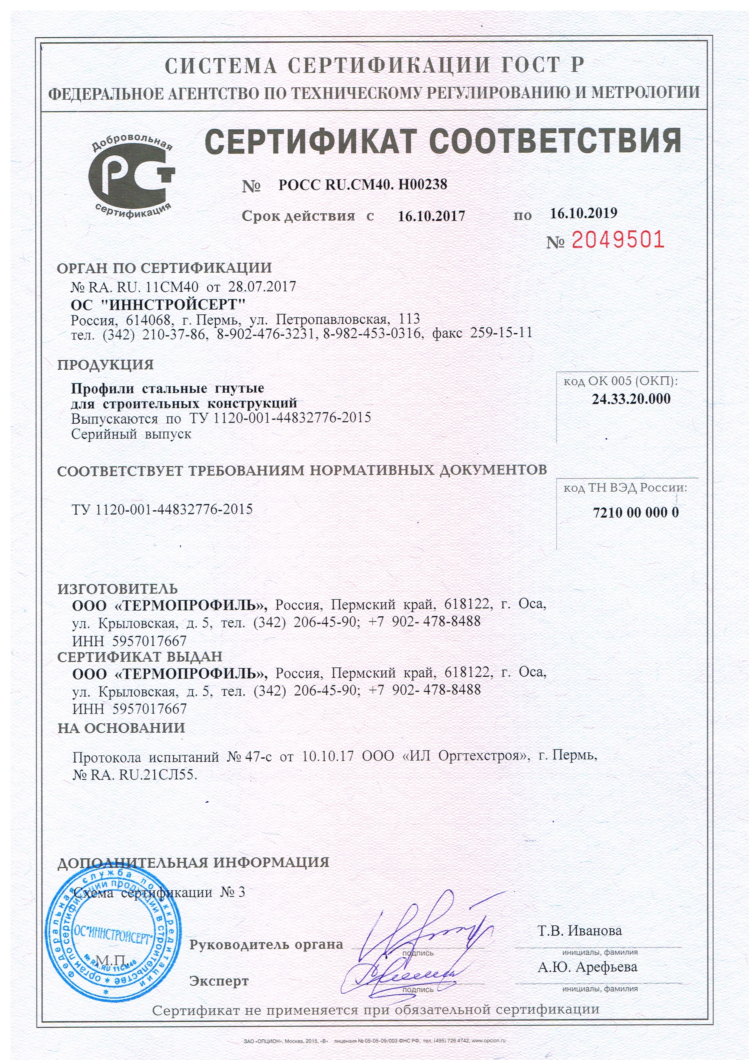 - Сертификат соответствия ГОСТ Р 2049501